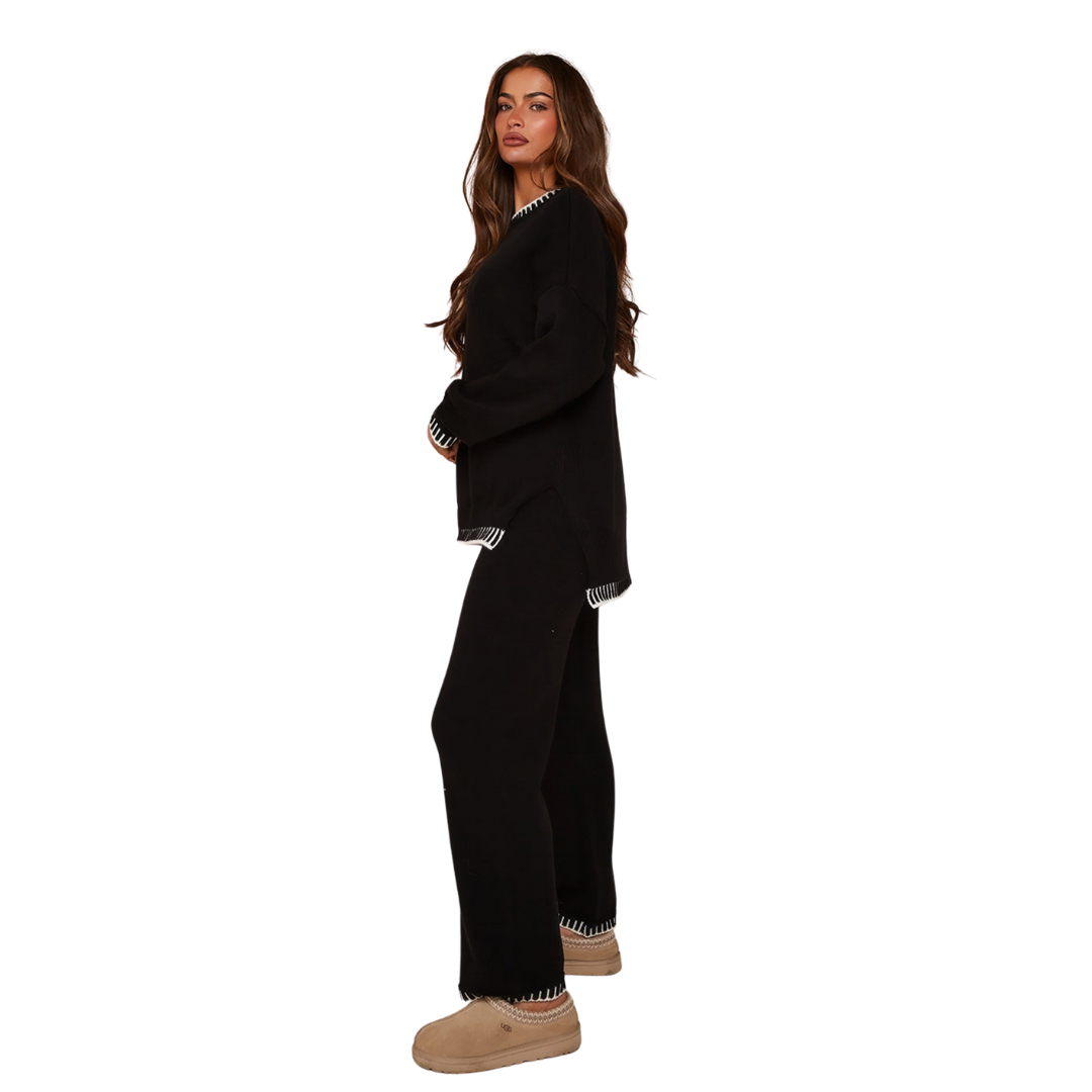 Offrez-vous un luxe décontracté avec notre Ensemble Tricot Confortable. Cet ensemble deux pièces combine un pull à coupe décontractée et un pantalon large assorti, tous deux fabriqués dans un tricot doux et chaud de teinte neutre élégante. Les subtils détails en contraste noir au col, aux poignets et aux ourlets ajoutent une touche stylée, rendant cet ensemble parfait aussi bien pour se détendre à la maison que pour sortir avec une allure décontractée chic.