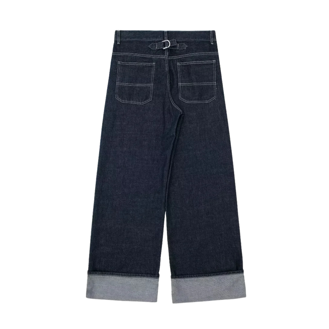 Élevez votre garde-robe décontractée avec ces Jeans en denim taille haute à jambe large, un mélange parfait de confort et de style contemporain. Conçus avec une taille haute flatteuse et une silhouette à jambe large, ces jeans offrent un look décontracté mais soigné qui se transforme sans effort du jour à la nuit. Le lavage indigo profond ajoute une touche classique, tandis que le détail d'ourlet roulé lui donne une touche moderne.