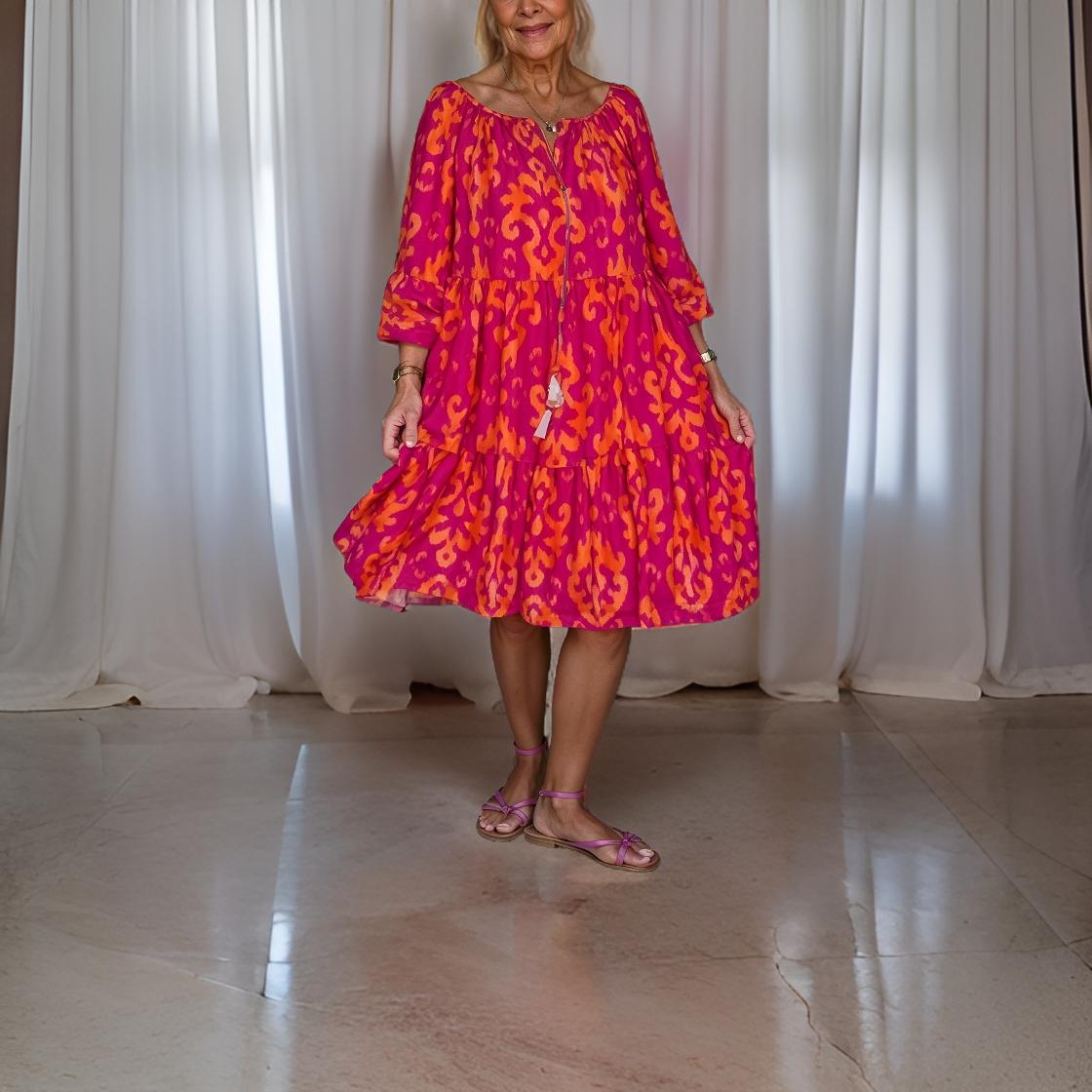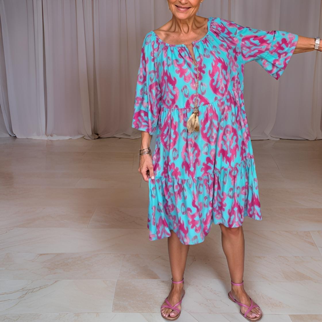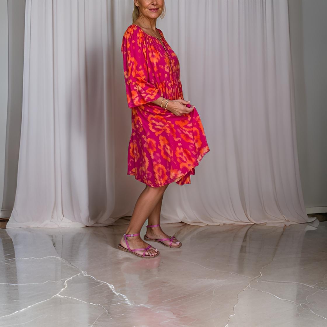 Laissez-vous séduire par la robe  Françoise™, une pièce incontournable pour toutes celles qui veulent allier style, liberté et confort. Avec son imprimé vibrant rose et orange, elle capte la lumière et attire tous les regards. Sa coupe ample et fluide offre une sensation de légèreté incomparable, parfaite pour les journées ensoleillées.
