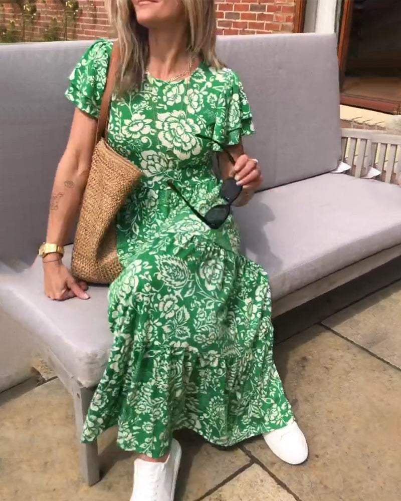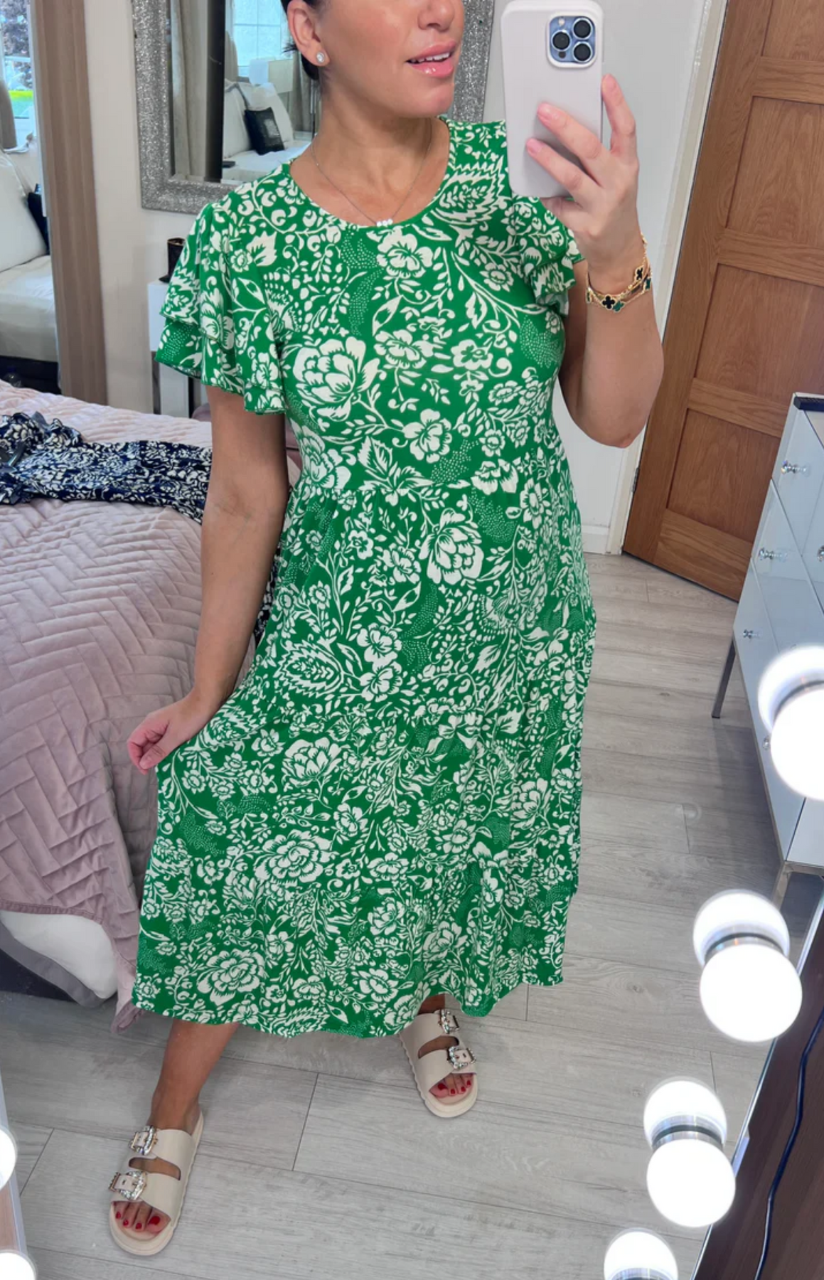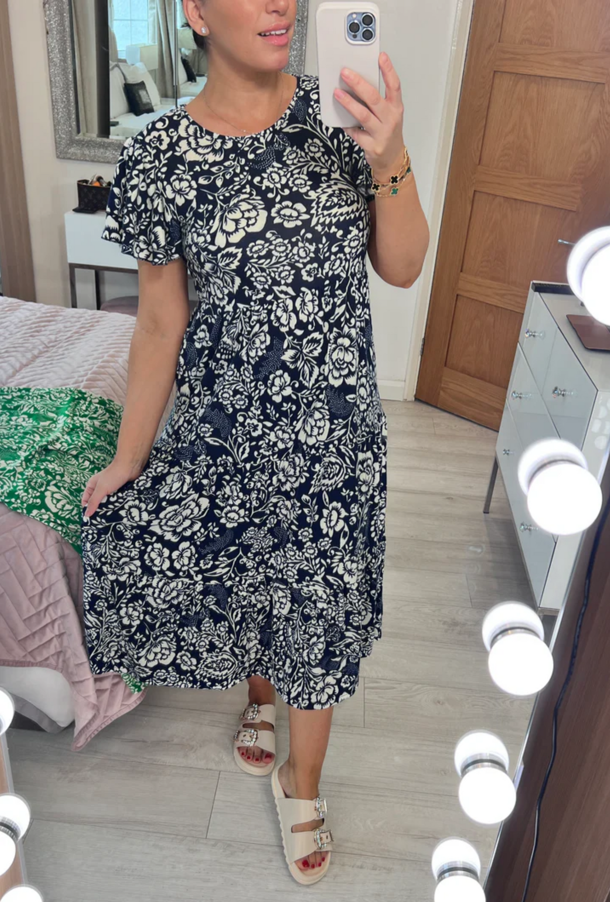 • Détails : Imprimé floral, manches courtes, taille élastiquée et longueur midi.