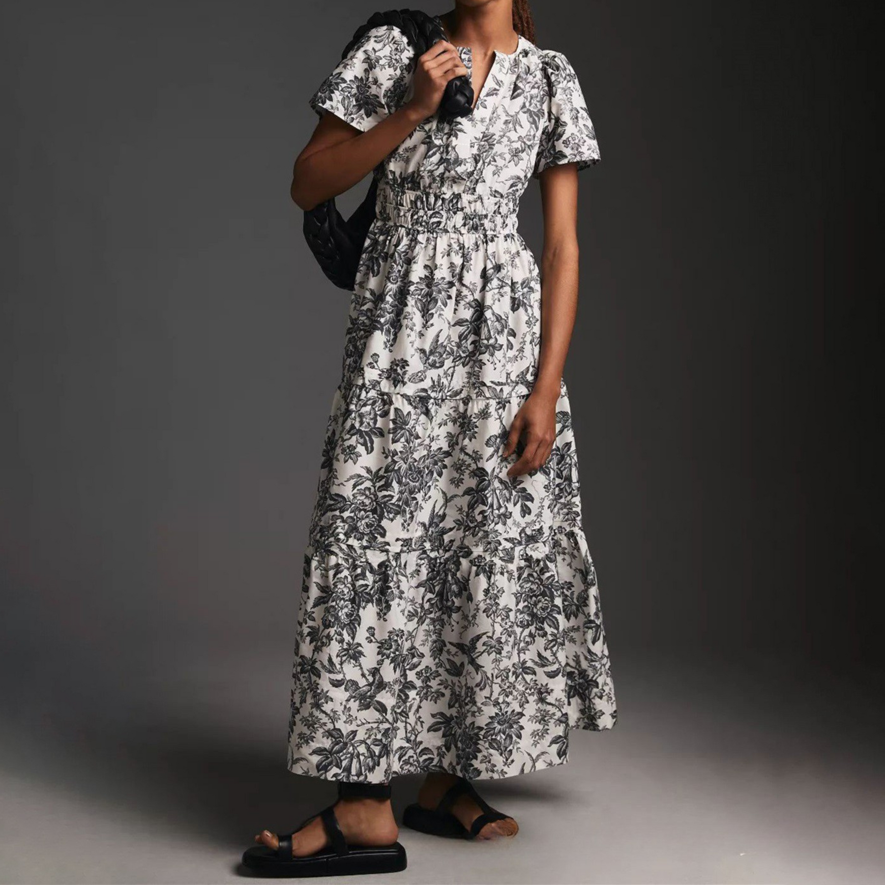 Fabriquée dans un mélange de coton et de viscose, elle est douce sur la peau, ne colle pas, et laisse circuler l’air librement. La taille subtilement froncée met en valeur votre silhouette tout en préservant votre liberté de mouvement. Avec son imprimé floral noir et blanc, elle séduit par sa sobriété chic et intemporelle.